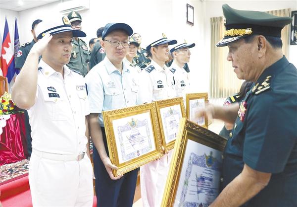 柬埔寨国防部21日下午在位于金边的王家军总医院举行仪式,为中国人民解放军第14批援柬医疗专家组暨海军军医大学第8批医疗专家组颁发“和平骑士勋章”,以表彰他们为柬埔寨医疗卫生事业发展,特别是为提高王家军总医院医疗水平作出的重要贡献。新华社发