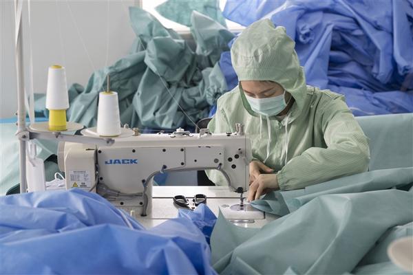 一、2月1日,在哈尔滨天使卫生材料厂,工人在生产缝纫车间缝制医用隔离衣。据介绍,这家工厂于1月26日复工生产,目前一天产量200件。日前,工厂第一批400件医用隔离衣已经验收通过,将调配到省市有关部门投入使用。 新华社 张涛 摄