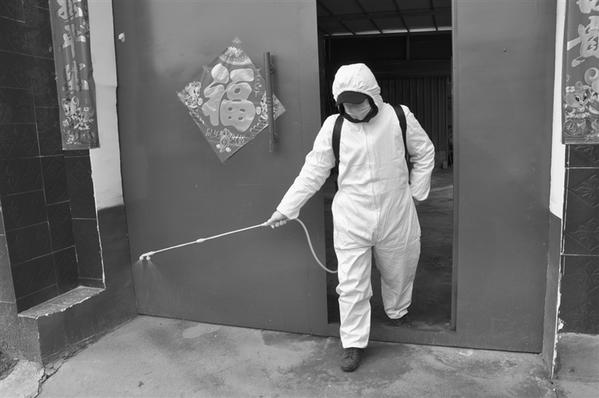 商水县邓城镇林村是全县首例新型冠状病毒感染的肺炎患者所在村,为了防止疫情扩散,确保全村村民安全,邓城镇于1月23日开始,劝说所有村民居家隔离观察,加强对全村的卫生消毒工作。目前,该村首例患者已痊愈出院,没有发现其他感染人员,村民生活稳定。图为2月4日上午,村医刘举芳身背便携式喷雾器为村民消毒。记者 付永奇 摄