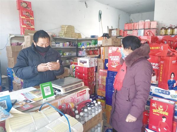 正在宣讲时,忽然手机响了起来,普彩英只好让喇叭自动播放乡里的防疫宣传录音。电话是安楼自然村的小学生武婷婷打来的,因为不满意父亲与邻居们在家中打牌,特意打电话“举报”。于是,普彩英喊上正在值班的驻村工作队员李坦一起前去。经过村中的超市时,普彩英与超市老板凡卫华进行了简单交谈(下图),得知油盐等生活用品齐全以及价格稳定后,向武婷婷家走了过去。