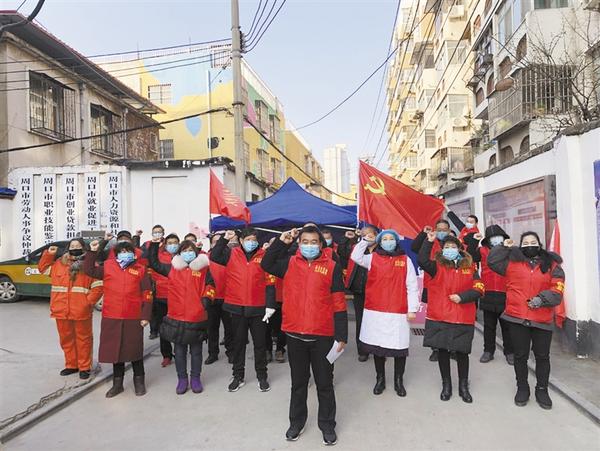 金海路街道办事处广大党员以社区、小区为“战场”,组建37个疫情防控临时党支部,在每个疫情防控点悬挂鲜红的党旗,全体党员面对党旗发出了“疫情不散,我们不退”的铮铮誓言。党组织充分发挥战斗堡垒作用,团结带领小区群众坚定信心抗疫情,为打赢疫情防控总体战阻击战凝聚了强大力量。
