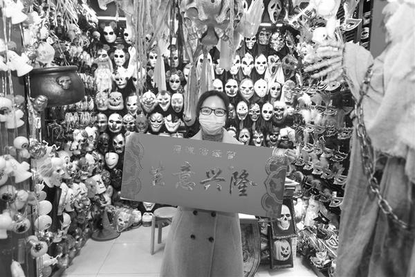 2月18日,义乌国际商贸城的商户吴红英在店铺内展示领取的“生意兴隆”新春横幅。当日,全球最大的小商品批发市场——义乌国际商贸城新春后首日开市。通过健康审核的市场商户已经做好准备,迎接全球客商的到来。新华社记者 黄宗治 摄