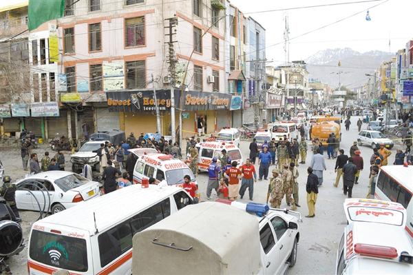2月17日,在巴基斯坦奎达,救护车停在自杀式袭击现场。