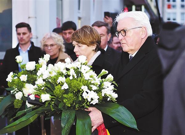 2月20日,在德国哈瑙,德国总统施泰因迈尔(右)在枪击案事发地献花悼念遇难者。当日,5000多民众聚集在哈瑙市中心的集市广场,悼念枪击事件遇难者。德国总统施泰因迈尔表示,德国社会必须团结起来,共同抵制仇恨、种族主义和暴力。新华社记者 逯阳 摄