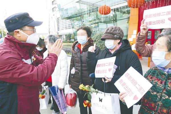 2月23日,在华中科技大学附属同济医院中法新城院区,中南大学湘雅二医院支援湖北抗疫国家医疗队队长刘先领(左一)向新冠肺炎治愈出院患者祝贺,患者则向其竖起大拇指致谢。当日,在武汉市华中科技大学附属同济医院中法新城院区,由中南大学湘雅二医院支援湖北抗疫国家医疗队收治的新冠肺炎患者中,首批11名重症患者治愈出院,其中年龄最大的82岁,年龄最小的38岁。新华社记者 沈伯韩 摄