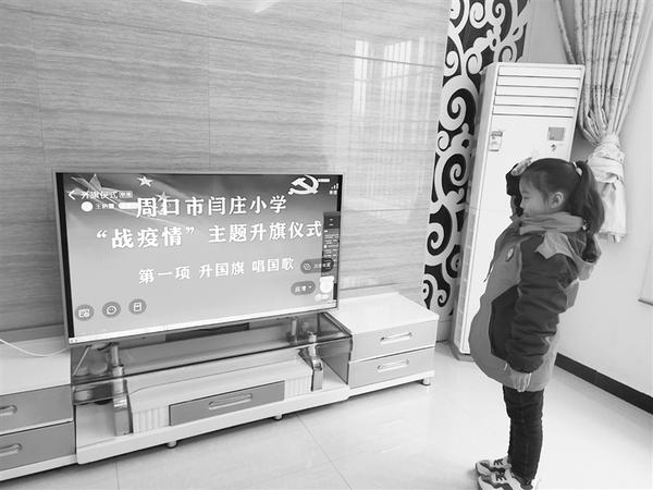周口市闫庄小学学生在屏幕前向国旗行队礼。