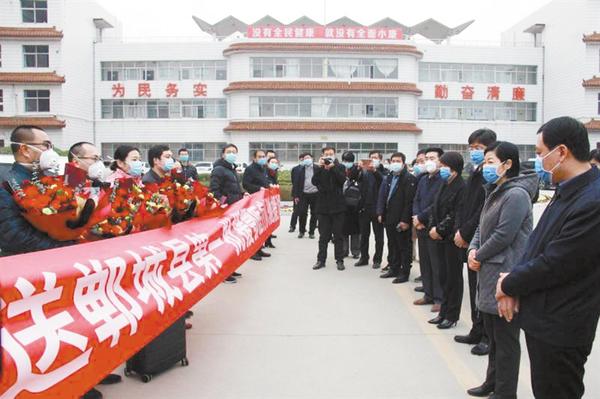 罗文阁在欢送仪式上指出,自疫情发生以来,以习近平同志为核心的党中央高度重视,把人民群众生命安全和身体健康放在第一位,全县5名医疗队员代表郸城,主动请缨、不畏艰险,不顾个人安危,舍小家为国家,逆行南下,支援武汉,奔赴前线,以实际行动诠释初心使命,扛起责任担当,发扬敢于战斗的精神,是大家学习的榜样,体现了家国情怀,体现了卫健系统敢打硬仗、能打胜仗的优良作风。
