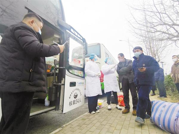 2月27日上午,西华县60名农民工乘坐杭州市龙元建设集团股份有限公司指派的专车前往杭州返岗复工。记者 张猛 摄