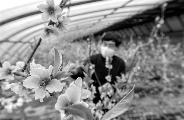 近日,河北省邯郸市邯山区硕果春农业园大棚内桃花绽放,果农抓紧农时进行管护作业。新华社发
