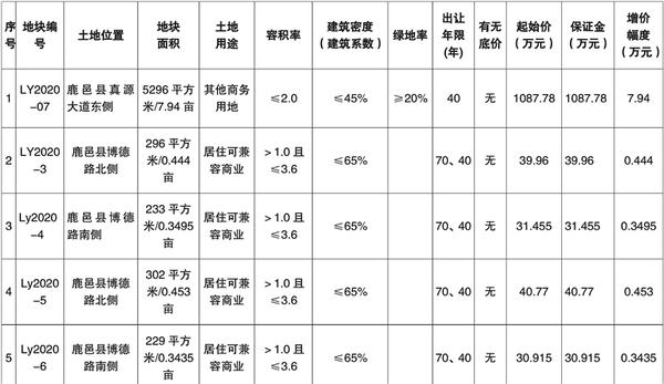 挂牌报价时间为:LY2020-07地块:2020年3月21日9时至 2020年3月31日15时。LY2020-3地块:2020年3月21日9时至 2020年3月31日15时10分。LY2020-4地块:2020年3月21日9时至 2020年3月31日15时20分。LY2020-5地块:2020年3月21日9时至 2020年3月31日15时30分。LY2020-6地块:2020年3月21日9时至 2020年3月31日15时40分。挂牌网址:鹿邑县公共资源交易平台(http://www.lyggzyjy.org.cn/)。