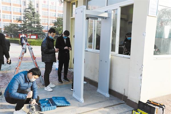 当日上午,记者看到,该测温设备类似一个宽1米左右的安检门,门的上面安装有检测设备,工作人员正在对该设备进行安装调试(如图)。如果通过这道门的人员体温超过设定温度,该设备就会自动语音报警,提醒工作人员作进一步的体温检测。除此之外,该设备还有专门的显示屏,可以显示进行检测人数、人员体温等信息。记者了解到,该设备投入使用后,不需要人工一对一对学生进行体温检测,学生只需要有序排队通过即可,可有效提高检测效率。此外,该学校还配备了手持测温热像仪,工作人员只需对准学生的面部,就可以快速检测体温。