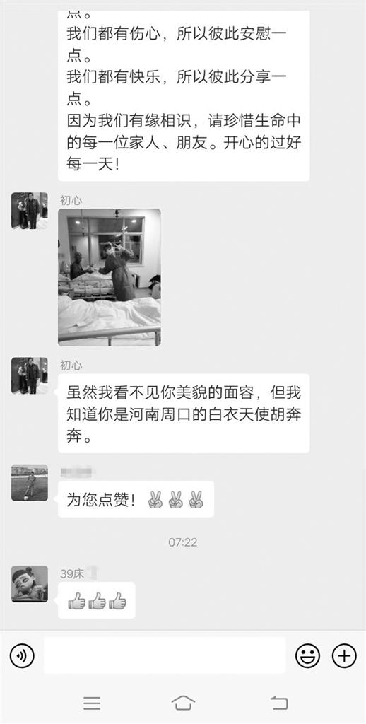 交班后的胡奔奔经过一番消毒、清洗,乘坐大巴返回驻地时已经10点多了。放松下来的她打开手机,看到了9号床患者发送到“14病区战疫群”的自己那张完全看不出任何美感的“武装照”。这位微信名叫“初心”的患者在群里这样写道:虽然我看不见你美貌(丽)的面容,但我知道你是河南周口的白衣天使胡奔奔。①6