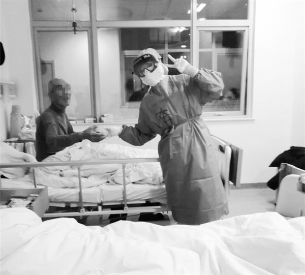 “这是我们应该做的工作。您辛苦了,一定要加油哦。”做完检测、量完体温,胡奔奔将9号床患者的手轻轻放进被子,并为他掖了掖被角。