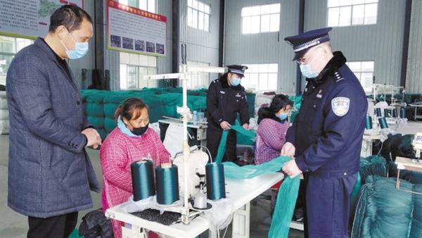2月29日,县公安局平店派出所所长苏丛博、副所长吕韶辉到该乡龙巢网业生产车间巡查,提醒工作人员注意疫情防控。近期,为帮助辖区小微企业安全复工复产,平店派出所对复工复产企业进行巡查,加强社会面巡逻防控,为企业生产创造了良好的社会环境。记者 付永奇 通讯员 郭利军 摄
