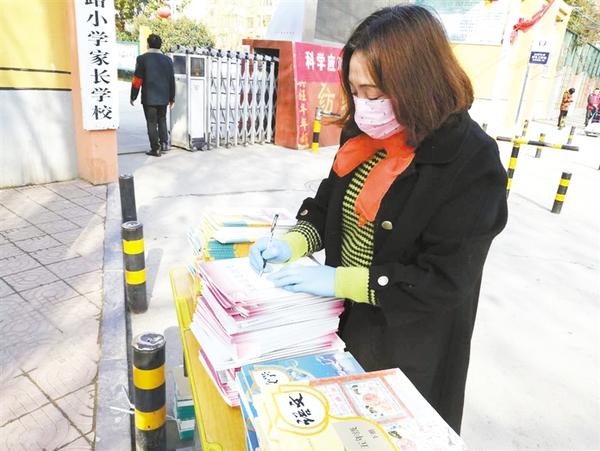 周口市纺织路小学教师在校外领书点做新学期教材登记工作。
