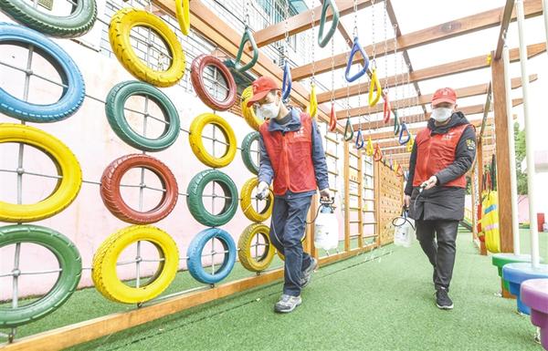 3月3日,志愿者们在幼儿园内进行消杀工作。当日,浙江省慈溪市钱海军志愿服务中心的志愿者们来到慈溪市浒山街道宏大幼儿园,对教室里的紫外线消毒灯进行维修和调试,同时喷洒消毒水,对校园进行义务防疫消毒。新华社记者 徐昱 摄