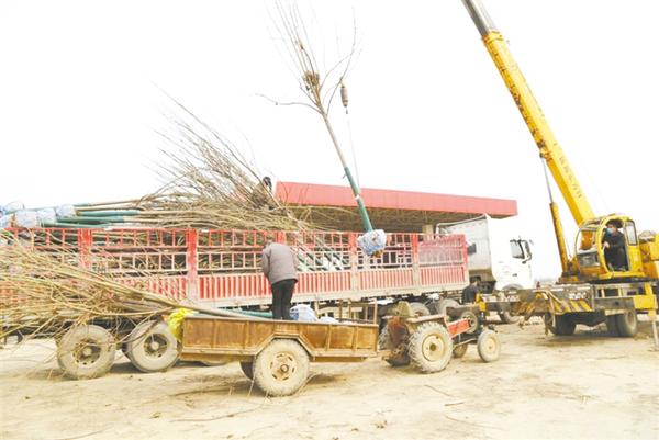 近日,楸树之乡曹河在做好疫情防控的同时,抢抓有利时机,引导村民分散作业,加强苗木管护,做到生产、防疫两不误。图为东黄行政村村民整理适龄树苗准备外销。