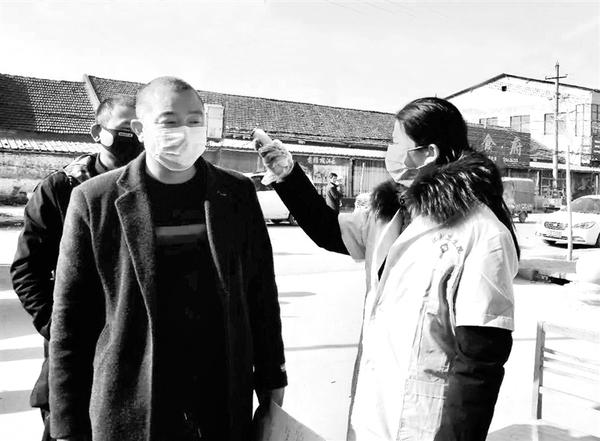 开封大学医学部2018级口腔医学专业一班的卢臻缜,在寒假期间自愿战“疫”,主动申请到扶沟县江村镇卫生院疫情防控第一线值勤,协助医务人员做好排查、测温、登记、预检等工作,让大学生的风采在疫情前线绽放光彩。图为卢臻缜在为入院人员测温。 记者 卢好亮 摄