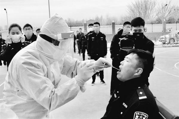 为进一步筑牢监管场所疫情防控防线,认真贯彻落实公安部《关于对全国公安监管场所有关人员开展新冠病毒核酸检测工作的通知》精神,实现“零输入、零感染”目标,郸城县公安局联合县疾控中心对县看守所所有民警、辅警和工勤人员等进行了新冠肺炎核酸检测,以战时标准、战时要求,最强措施、最大力度,确保防控到位、万无一失。图为检测现场。 记者 卢好亮 摄