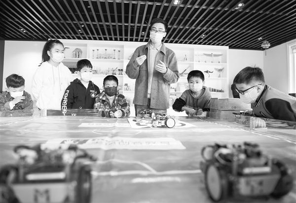 3月25日,合肥市科技馆常青街道社区分馆工作人员向孩子们介绍机器人知识。