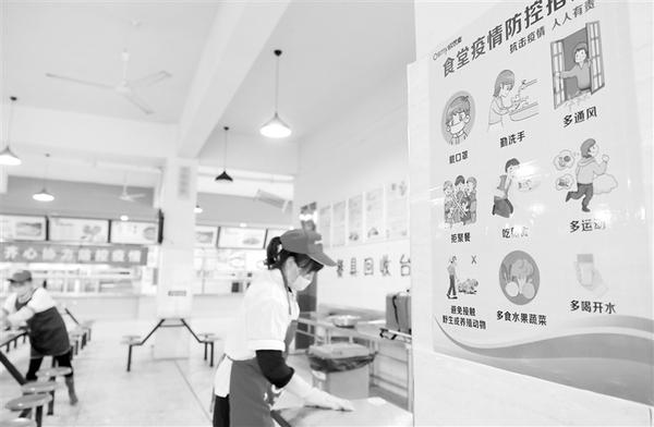 3月27日,在江西省南昌市湾里区第一中学内,工作人员在学生食堂进行开学复课前的大扫除工作。江西省各地高三、初三年级学生将于4月7日返校学习,各地学校目前正在进行防疫物资储备、校园各区域公共设施清洁消杀等工作,为开学复课做好准备。新华社记者 彭昭之 摄