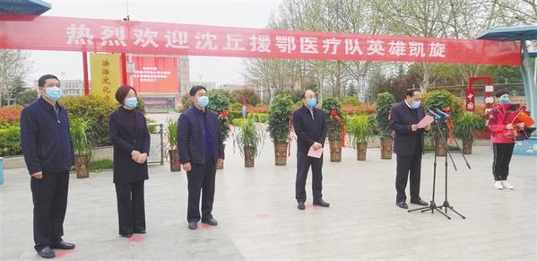 本报讯 (记者 韦伟 文/图) 勇士逆行时,朔风凛冽寒未尽;英雄归来日,春华正浓花满枝。3月30日下午,沈丘县4名援鄂医疗队队员凯旋。县长刘国庆,县委常委、县政府党组成员马伟,县人大常委会副主任闫开兴,县政协副主席张瑛,副处级干部、县卫健委主任张治君及有关医疗单位负责人、医务人员代表、家属代表参加欢迎仪式(如图)。马伟主持欢迎仪式。