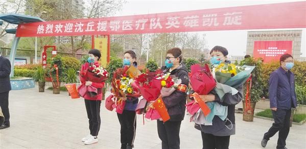 据了解,沈丘县4名援鄂医护人员分别是县中医院心病科主任、副主任医师高艳艳,县人民医院神经内科护士长范爱华、内分泌科护士长刘依雯、护士马鑫。在武汉支援的30多个日夜里,4名医护人员与来自全国各地的医护人员一道,坚守在疫情防控第一线、战斗在抗击病毒最前沿,与时间赛跑、与病魔较量,以崇高的医德、精湛的医术、过硬的作风,筑起了一道坚不可摧的防疫“堤坝”,出色完成了救治任务,为夺取武汉保卫战、湖北保卫战的胜利作出了积极贡献。②8