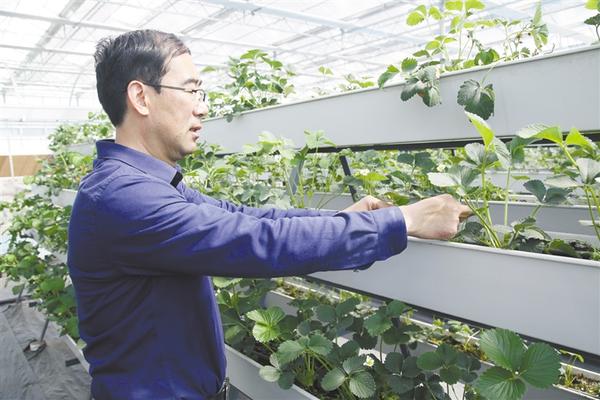 3月31日,在项城市丁集镇绿色基地里,村民杜长虹正在管理草莓。这里的草莓全部采用高架立体模式栽培,最大限度利用了空间,便于集约化管理,促进了农业增效、农民增收。