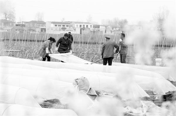 4月1日,在商水县袁老乡贾阁村,农民们正在田间给西瓜苗覆膜。连日来,气温回暖,该县农民抢抓农时投入春耕春种,田间地头处处是一幅幅美不胜收的春耕图。