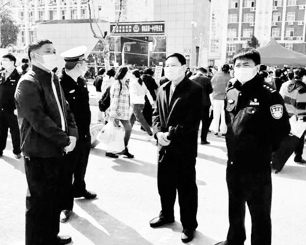 为确保高三学生顺利返校复课,近日,郸城县公安局组织近百名民警、辅警到主要街道、路口、学校周边进行执勤,打通学生返校安全快速通道,确保学生及时入校学习。图为该局领导在执勤点检查学生返校复课安全保障工作。