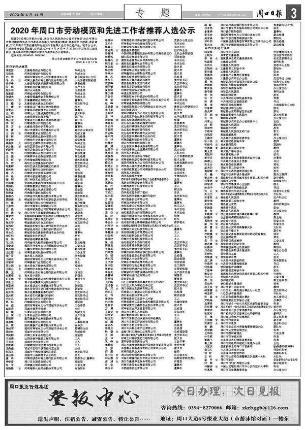 根据《中共周口市委办公室、周口市人民政府办公室关于做好2020年周口市劳动模范和先进工作者评选表彰工作的通知》精神,经基层民主推荐,逐级审核,2020年周口市劳动模范和先进工作者推荐人选名单已经产生,现予以公示,广泛接受社会各界监督,公示期2020年4月14日~4月20日(5个工作日)。如有异议,请与周口市劳动模范评审工作委员会办公室联系。