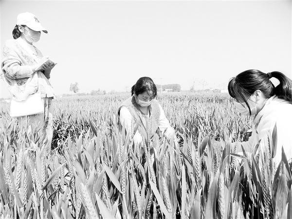 4月15日,在沈丘县周营镇一处万亩小麦高产示范方基地,农技人员正在调研小麦生长情况和病虫害的发生情况。连日来,该县农业农村局积极抽调200余名农技人员指导农民扎实做好当前小麦的管理工作,力争夺取小麦丰产丰收。谢辛凌 摄