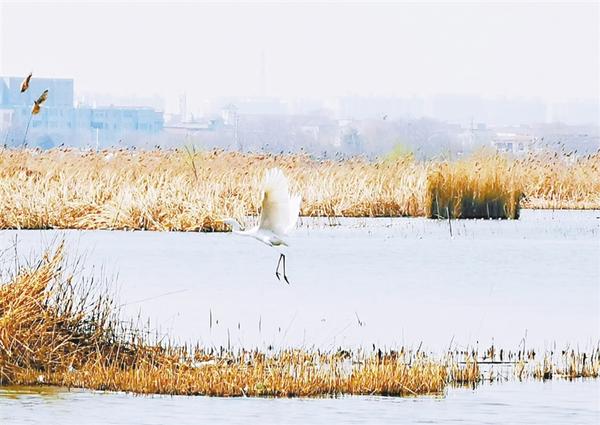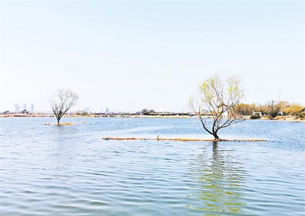 春日的淮阳万亩龙湖,春和景明,碧波荡漾,浅滩处树木挂上了一抹鹅黄绿,不时有水鸟掠过水面,生机盎然,春色无限。