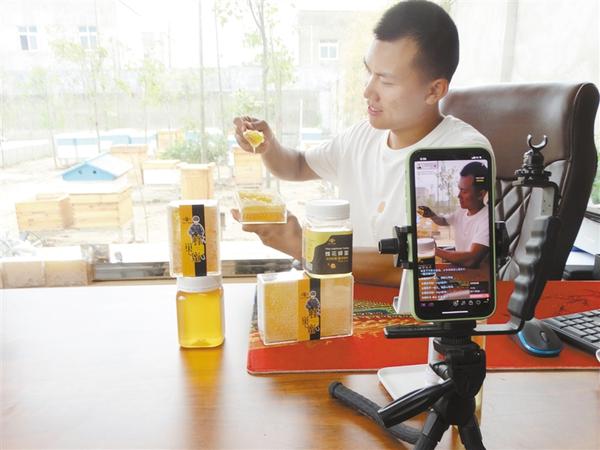 4月21日,沈丘县付井镇九里村的一处生态蜜蜂养殖基地,村民苏尚方正在自己的直播间网销蜂蜜。据了解,去年,苏尚方靠放养蜜蜂并依靠网络销售蜂蜜致富后,成立了苏家养蜂专业合作社,采取“合作社+基地+农户”的方式,带领当地群众一起致富奔小康。谢辛凌 摄