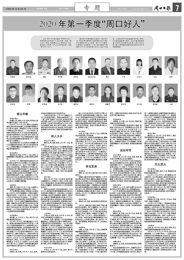 近日,周口市文明办组织“季评周口好人”评审委员会成员进行了2020年第一季度“周口好人”评选。按照群众公认、事迹突出、社会影响面广的原则,公平公正地评选出第一季度“周口好人”22人。