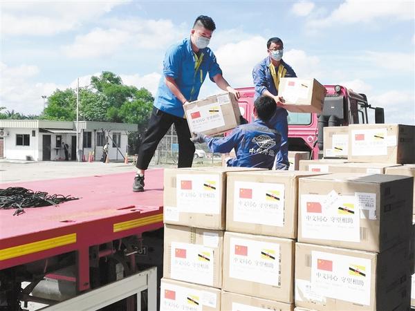 4月23日,在文莱斯里巴加湾市,工作人员搬运中国政府捐助的抗疫物资。