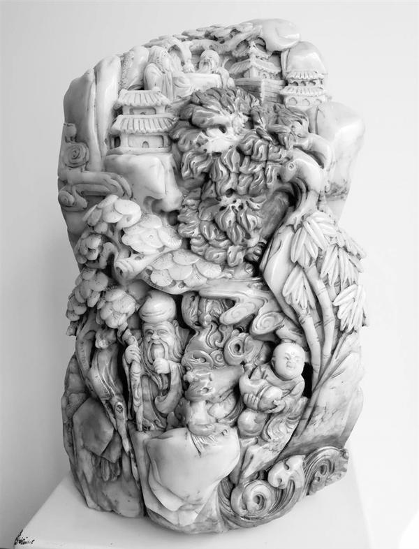 玉山子作为一种特殊品种,出现于两宋时期。《宋史·礼乐志·宴飨》云:“诏辅臣观粟于后苑御山子。”记述宋真宗与群臣观赏御廷中之石假山之事。事后君臣造词作诗留念,玉工受此启发,将整块璞玉精雕细刻,使其形如山状,始做“玉山子”。金元时代的作品,以山林、动物、人物为题材,明代多以山石、树木为主要内容。清代山子雕刻水平又达到一个崭新的高度,常在一件作品上,立体生动地刻画出山水、草木、人物、动物,并运用高浮雕、浅浮雕、线刻、刻款、透雕等技法,使雕刻技艺达到炉火纯青的境界。后来,由于和田大块玉料来源匮乏,玉山子雕琢由此衰败。新中国成立后,玉首饰缺乏市场,山石摆件虽兴盛多年,但真正玉质上乘的和田玉籽料大型山子却很难寻觅。毫不夸张地说,像这样大的和田玉籽料山子,包括馆藏并不多见。玉雕具有的东方韵味和美学特征,使本来没有生命的物体在匠心独运的雕琢下,给人们带来了无限的启示和遐想。其中的妙趣只有具备美学文化底蕴的人,才能有所领悟,并在领悟中陶冶情操、净化心灵。
