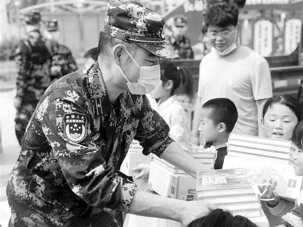 为坚决打赢脱贫攻坚战,4月30日上午,武警河南总队周口支队,来到商水县付楼村,给这里的贫困户送来生活物资。图为武警官兵给付楼村的贫困家庭子女捐赠图书、文具等学习用品。 记者 孙靖 摄