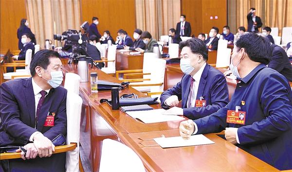 5月12日,参加市四届人大五次会议的人大代表就大会上所做的政府工作报告等内容进行讨论交流。
