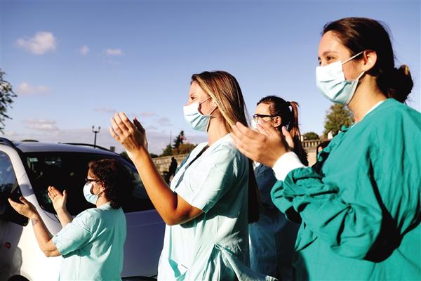 5月12日,葡萄牙首都里斯本的圣玛利亚医院的医护人员为“法朵”音乐表演团队“月光小夜曲”成员表演的“法朵”乐曲鼓掌。