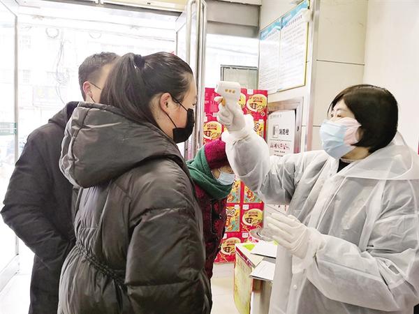 记者一边配合着测量体温,一边询问防损员一天接触那么多的顾客,意味着比普通人面临更大的风险,也承担着比普通人更大的压力,是否害怕。“不是不害怕,但是我们不能退缩。因为我们知道,企业的肩上承担着保障市民基本生活的责任,我们是企业的一员,就要走在前面,向疫情前线的医务人员学习。”防损员说。