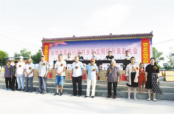 5月19日下午,张明乡屈庄村对评选出的好婆婆、好媳妇、政策知晓明白人、环境卫生先进户、励志脱贫先进户、未脱贫励志光荣户等先进模范进行表彰。图为表彰会现场。