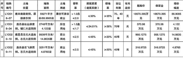 七、挂牌时间及网址:挂牌报价时间为:LY2018-57地块: 2020年6月15日9时至2020年6月24日15时。LY2018-34地块: 2020年6月15日9时至2020年6月24日15时10分。LY2020-10地块:2020年6月15日9时至2020年6月24日15时20分。LY2020-11地块:2020年6月15日9时至2020年6月24日15时30分。挂牌网址:鹿邑县公共资源交易平台(http://www.lyggzyjy.org.cn/)。