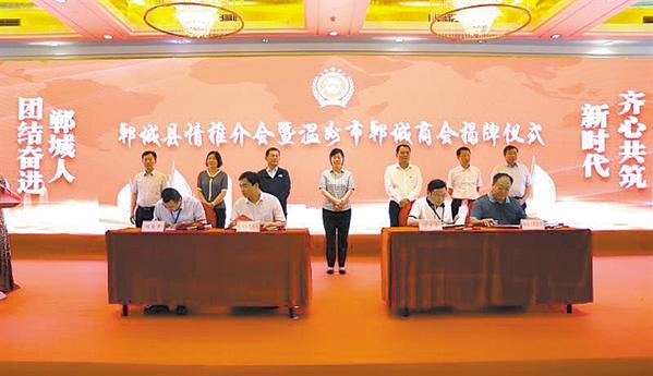 本报讯(记者 徐松 通讯员 罗明丰 李剑锋 文/图) 千里赴江浙,畅叙桑梓情谊;游子竞反哺,助力郸城发展。5月27日、28日,市人大常委会副主任、郸城县委书记罗文阁带领郸城党政考察团到浙江省温州市进行商务考察、招商,并为温州市郸城商会揭牌,一举签约6个项目,总金额11.3亿元。县领导李全林、李建军、王伟、薛燕、张凯及相关部门负责人参加考察。