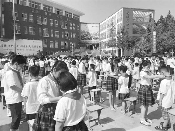 6月1日,周口市文昌小学230名四、五年级少先队员和230名一年级学生参加“红领巾,引领我成长”入队仪式。入队仪式上,该校高年级学生为低年级学生戴上了红领巾,230名一年级学生正式成为了光荣的少先队员。 记者 王珂 通讯员 李永涛 摄