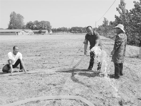 6月8日,商水县农业农村局驻邓城镇杨河村第一书记周文闯(图中)和驻村工作队员杜新锁帮助贫困户抗旱浇水。