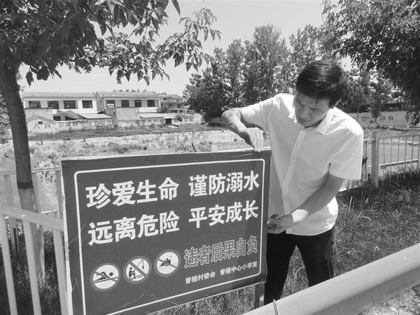 6月9日,商水县黄寨镇政府干部陆海军在镇政府所在地曾楼村坑塘边设置防溺水宣传警示牌。 黄寨镇有100多个经过改造的坑塘,坑陡水深。为防止溺水事故发生,黄寨镇政府组织镇、村干部和学校校长在所有坑塘边设置安全警示牌,并通过上安全课、发放安全知识宣传单等形式,对农村中小学生进行夏季防溺水安全教育。 乔连军 摄