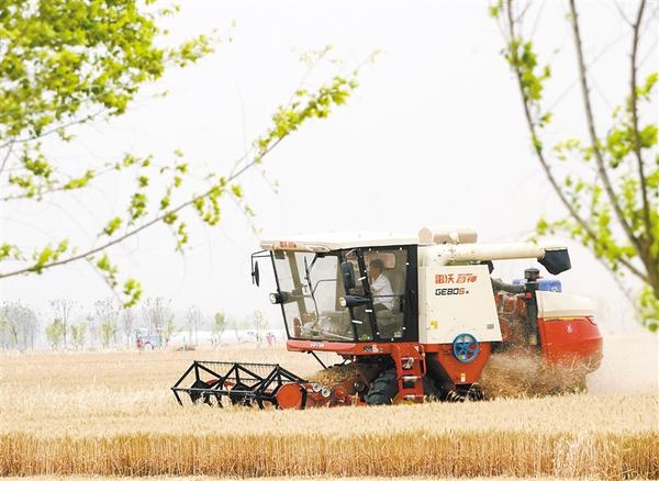 在河南省商水县的高标准农田示范区内,农机手操作机械收割小麦(5月29日摄)。 新华社发