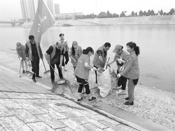 本报讯 (记者 张洪涛 文/图) 6月13日,周口中心城区沙颍河南岸(中州大道桥至八一大道桥段)一片热闹景象,70多名穿着红马甲的志愿者聚集在这里,参加“守护母亲河 环保志愿行”社会服务活动,以实际行动助力“创卫”,让沙颍河水清岸绿景美。