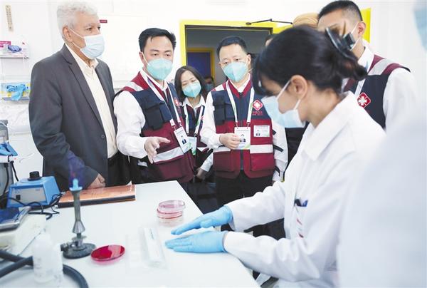6月14日,在约旦河西岸城市拉姆安拉,中国赴巴勒斯坦抗疫医疗专家组考察巴勒斯坦卫生部下属的中央公共卫生实验室。新华社发